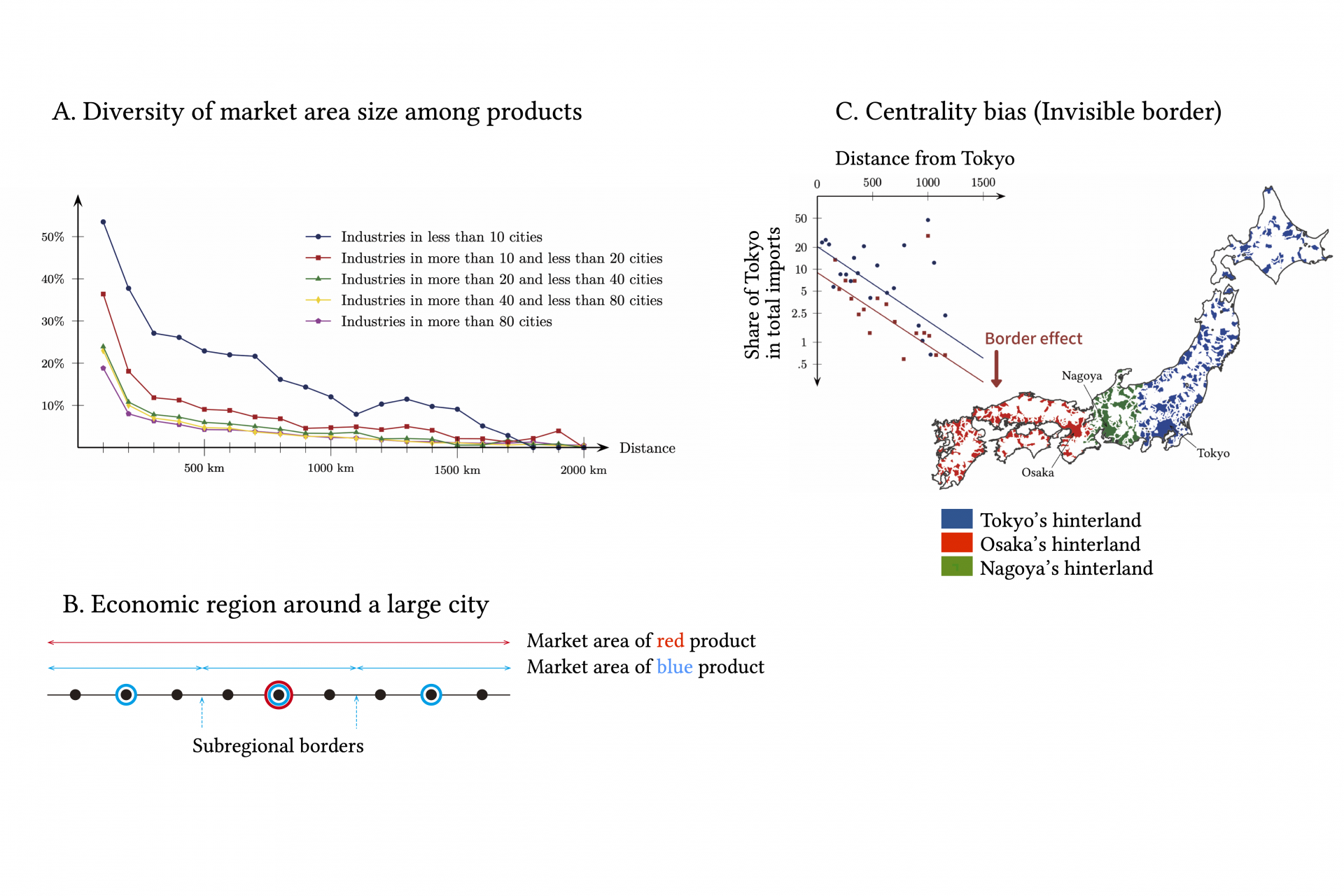 This paper demonstrates the formation of economic regions using intercity trade data of Japan and the US. In a regional economy, a nested city arrangement is realized. Small cities surround large cities, and even smaller cities further surround each of these small cities. The so-called central place theory explains such city arrangements in terms of the spatial coordination of many industries. For example, in industries with high fixed costs, large markets are required for firms to enter. Thus, firms are located only in a few cities, and goods and services are widely supplied. On the other hand, in industries with low fixed costs, even small markets can suffice for firms to enter, so they are found in many cities. Analysis of trade data between cities confirms that industries located in fewer cities export more extensively (Fig. A). While the spatial frequency of appearance varies among industries, different industries tend to attract each other and be located in a common city because many goods and services share consumers, directly and indirectly. For example, a city with a theater also has a movie theater; a city with a movie theater also has a bakery. (Conversely, a city with a bakery does not necessarily have a movie theater. A city with a movie theater does not necessarily have a theater.) A city’s industrial diversity and population size correlate so that cities with many industries tend to be large. In contrast, cities with only a few industries tend to be small. Fig. B summarizes the resulting industrial location and urban layout. Central place theory asserts that the market area of industries specific to a given city constitutes an economic region of the city, as indicated in Fig. B. Analysis of inter-city trade data confirms the presence of invisible trade barriers at the approximated regional borders. The exports from a large city (central place) decline by two-thirds to half in crossing the border in addition to the decline over distance (Fig. C). Mori et al. (2020) show that the same set of regions exhibit common power law for city size distributions.